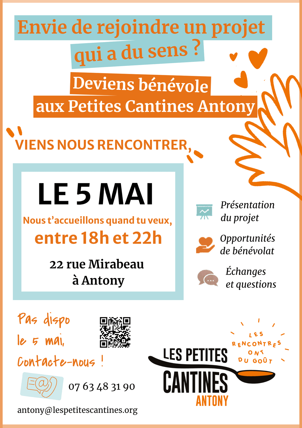 Alors si vous avez un peu de temps, de façon ponctuelle ou régulière, rejoignez notre équipe de bénévoles pour organiser des Cantines Éphémères, des événements conviviaux, trouver d'autres financements, apporter vos idées et communiquer sur ce SUPER projet.